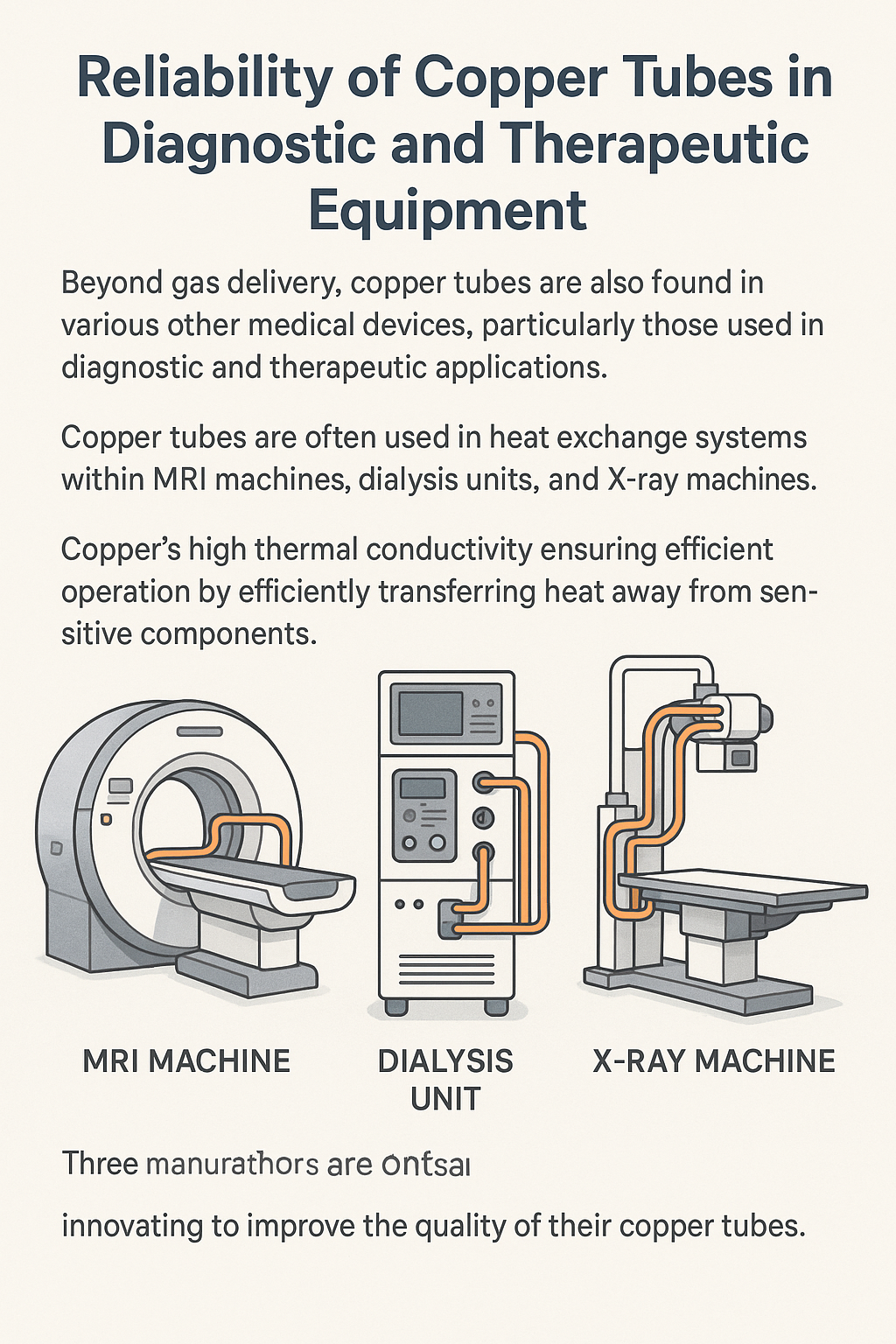 | Diagnostic Equipment | Copper tubes are used in MRI, X-ray machines, and dialysis units for heat exchange. | High thermal conductivity ensures efficient heat transfer, enhancing the performance of equipment. |