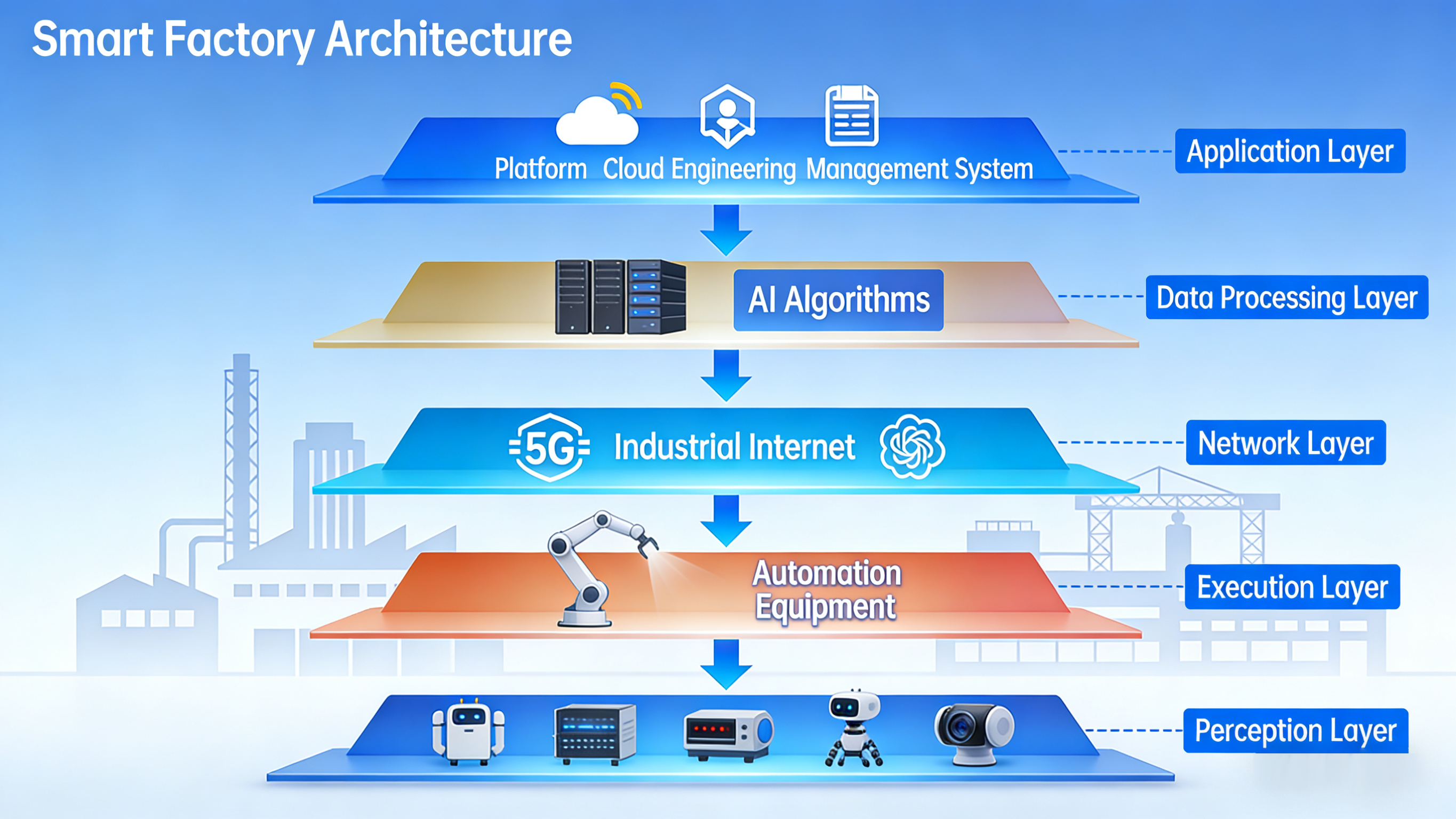 รูปภาพ: โดยทั่วไปแล้ว สถาปัตยกรรมโรงงานอัจฉริยะประกอบด้วยการรับรู้ เครือข่าย การประมวลผลข้อมูล การดำเนินการ และเลเยอร์แอปพลิเคชัน ซึ่งช่วยให้สามารถรับส่งข้อมูลจากเซ็นเซอร์ไปยังแพลตฟอร์มคลาวด์ได้