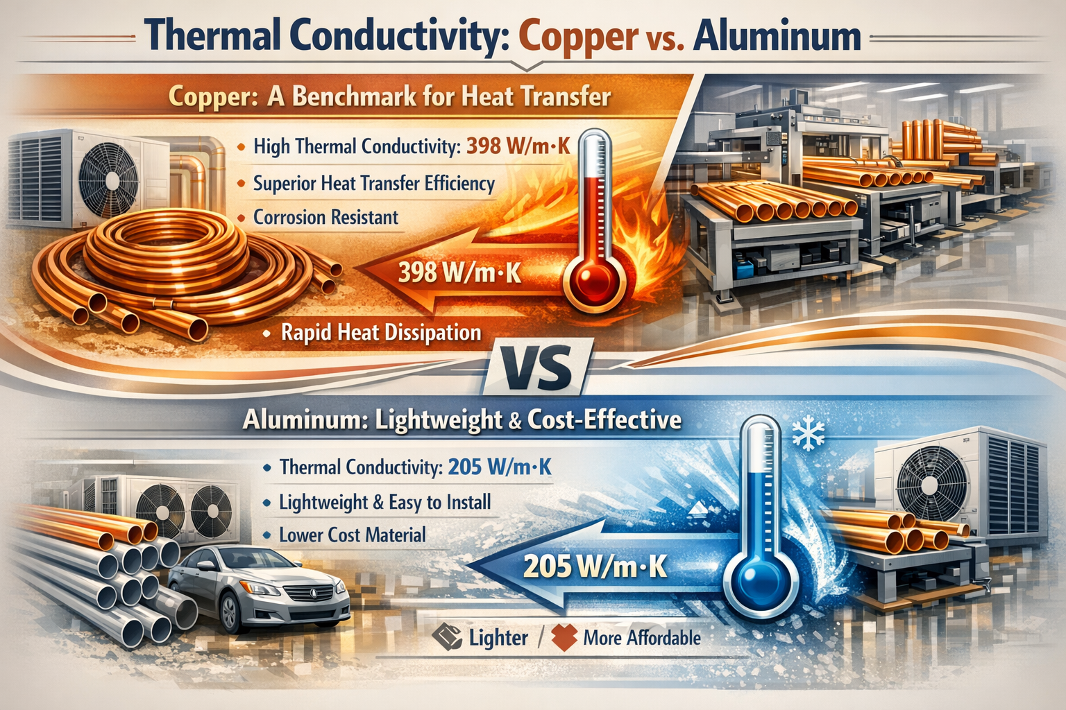 This table highlights the distinct differences between copper and aluminum tubes, with copper offering superior heat transfer but at a higher cost, while aluminum is more lightweight and cost-effective but comes with trade-offs in performance and durability.