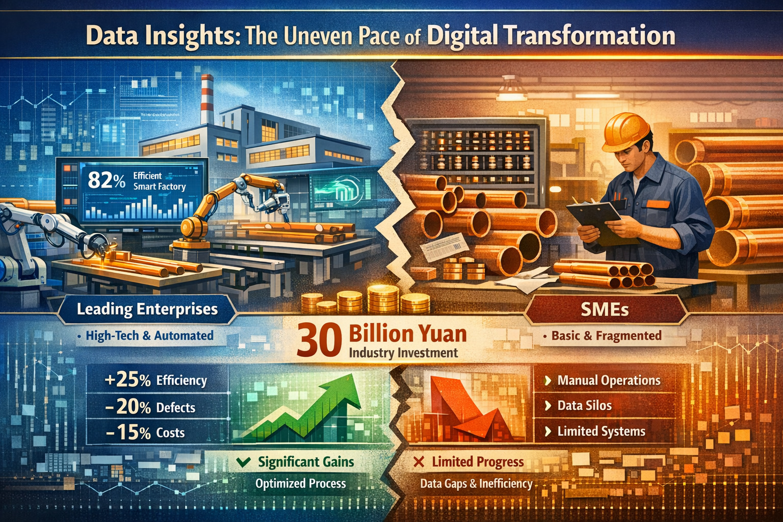 ผู้ผลิตท่อทองแดงขนาดเล็กและขนาดกลางส่วนใหญ่มีความเข้าใจผิดอย่างร้ายแรงเกี่ยวกับการเปลี่ยนแปลงทางดิจิทัล เพียงแค่เทียบเคียงกับ "การออนไลน์" หรือ "การเปลี่ยนผ่านระบบอิเล็กทรอนิกส์" พวกเขาเชื่อว่าการใช้ระบบ ERP และการถ่ายโอนบันทึกทางกระดาษทางออนไลน์ถือเป็นการบรรลุการเปลี่ยนแปลงทางดิจิทัล ความเข้าใจนี้มองข้ามคุณค่าหลักของการเปลี่ยนผ่านสู่ดิจิทัล— การเพิ่มประสิทธิภาพการผลิต , ห่วงโซ่อุปทาน และ การบริการลูกค้า ผ่านข้อมูลเชิงลึกที่ขับเคลื่อนด้วยข้อมูล จึงบรรลุการปรับปรุงประสิทธิภาพโดยรวมและการสร้างมูลค่าทั่วทั้งห่วงโซ่