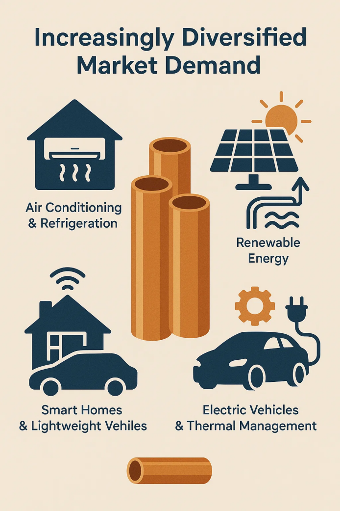 ด้วยการพัฒนาที่รวดเร็วของบ้านอัจฉริยะยานพาหนะที่มีน้ำหนักเบาและการใช้พลังงานไฟฟ้าสถานการณ์แอปพลิเคชันของหลอดทองแดงก็ขยายตัวเช่นกัน หลอดทองแดงประสิทธิภาพสูงไม่เพียง แต่เป็นองค์ประกอบหลักสำหรับคอนเดนเซอร์และเครื่องระเหยในเครื่องใช้ในบ้าน แต่ยังมีบทบาทสำคัญในระบบการจัดการความร้อนของยานพาหนะพลังงานใหม่ ตลาดนี้คาดว่าจะเติบโตต่อไป