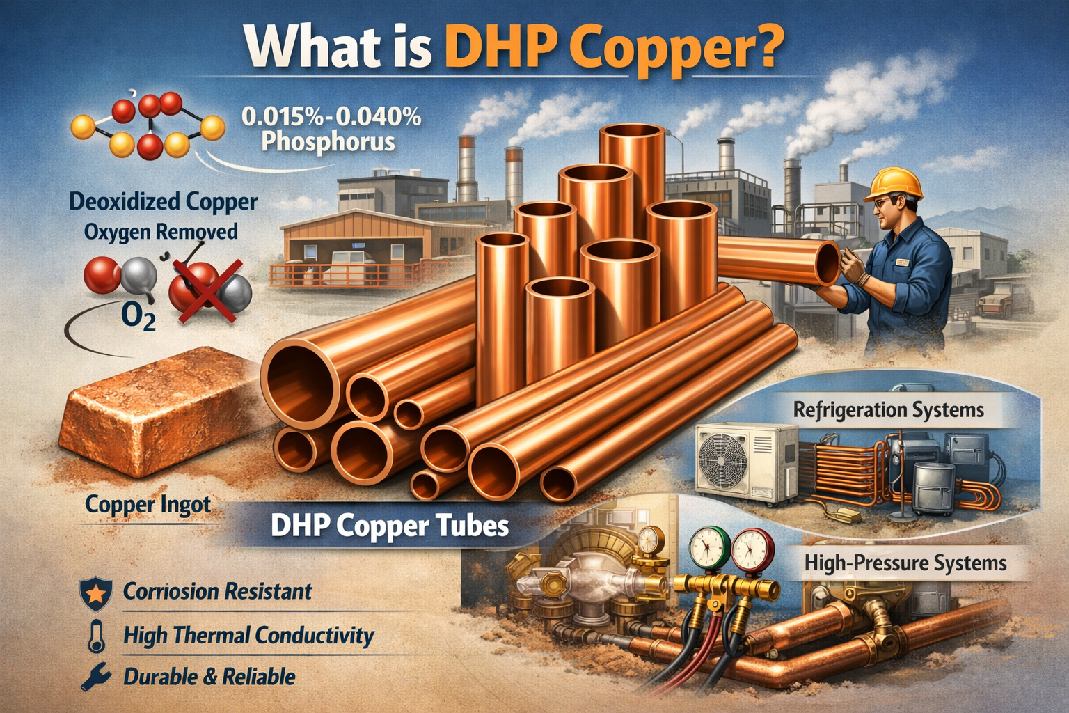 ทองแดงดีเอชพี เป็นผลิตภัณฑ์คุณภาพสูง ทองแดงที่ถูกออกซิไดซ์ โลหะผสมที่ประกอบด้วยจำนวนเล็กน้อย ฟอสฟอรัส โดยทั่วไปจะอยู่ระหว่าง 0.015% ถึง 0.040% คุณลักษณะหลักของทองแดงนี้คือได้รับการบำบัดเพื่อกำจัดออกซิเจน ซึ่งเป็นกระบวนการที่ปรับปรุงความต้านทานต่อการกัดกร่อน และรับประกันประสิทธิภาพที่ดีขึ้นในระบบแรงดันสูง ปริมาณฟอสฟอรัสยังช่วยเพิ่มคุณสมบัติอีกด้วย ทำให้เหมาะสำหรับการใช้งานที่ความทนทาน การนำความร้อน และความแข็งแรงเป็นสิ่งสำคัญ